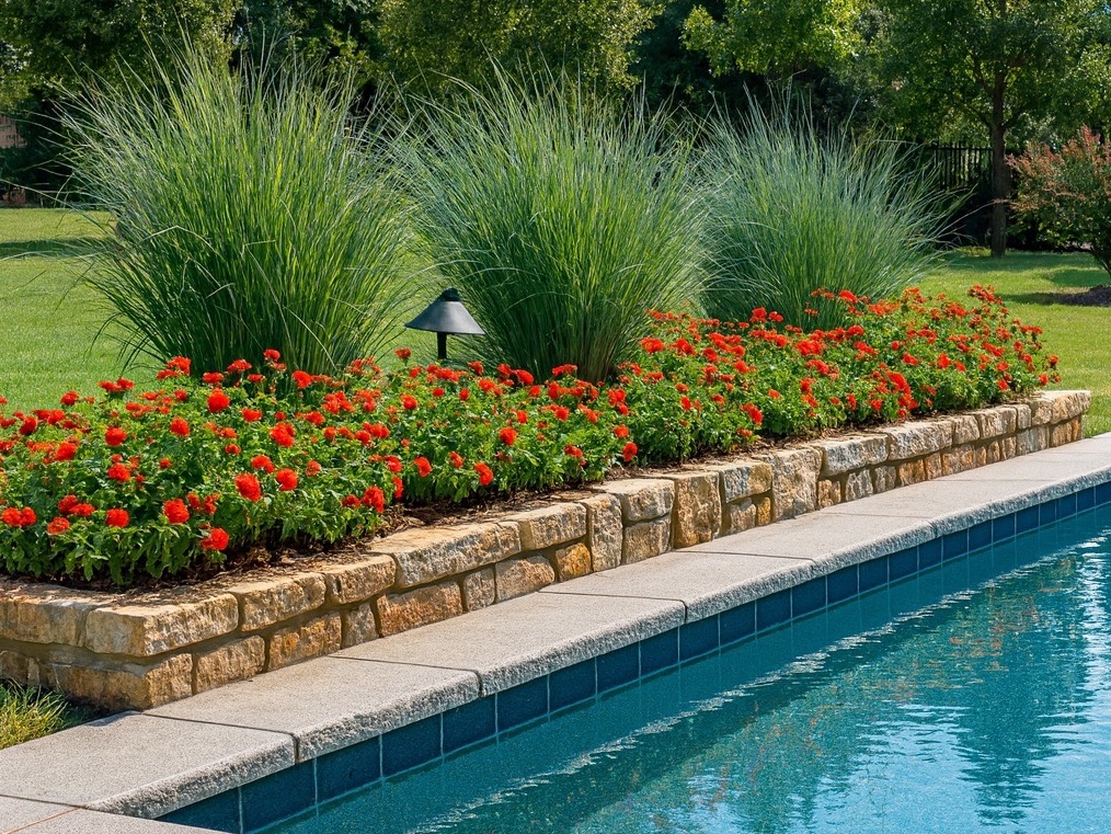 Heat-tolerant landscape design around existing pool with decorative stone edging and coordinated lighting system.